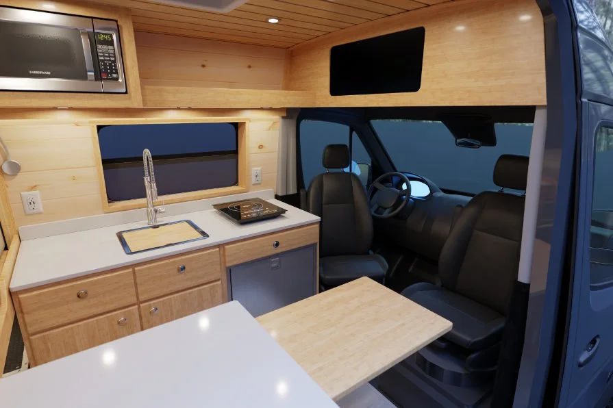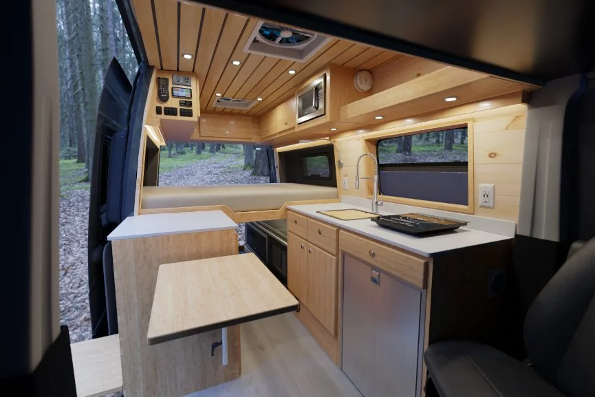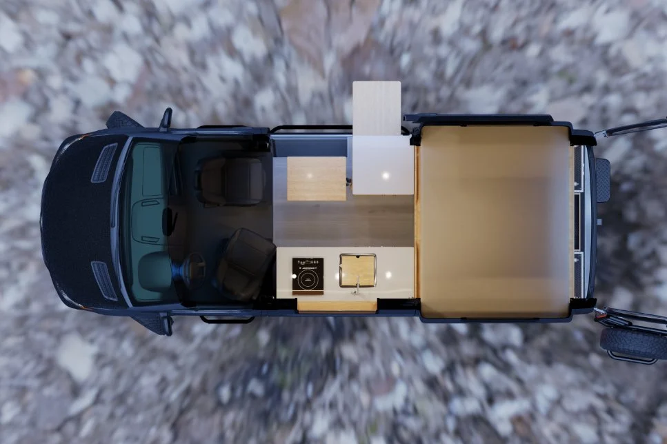 The SK1 is a compact and functional two person camper van layout with no interior shower. For those who want extra storage instead of an interior wet bath, the SK1 is for you.