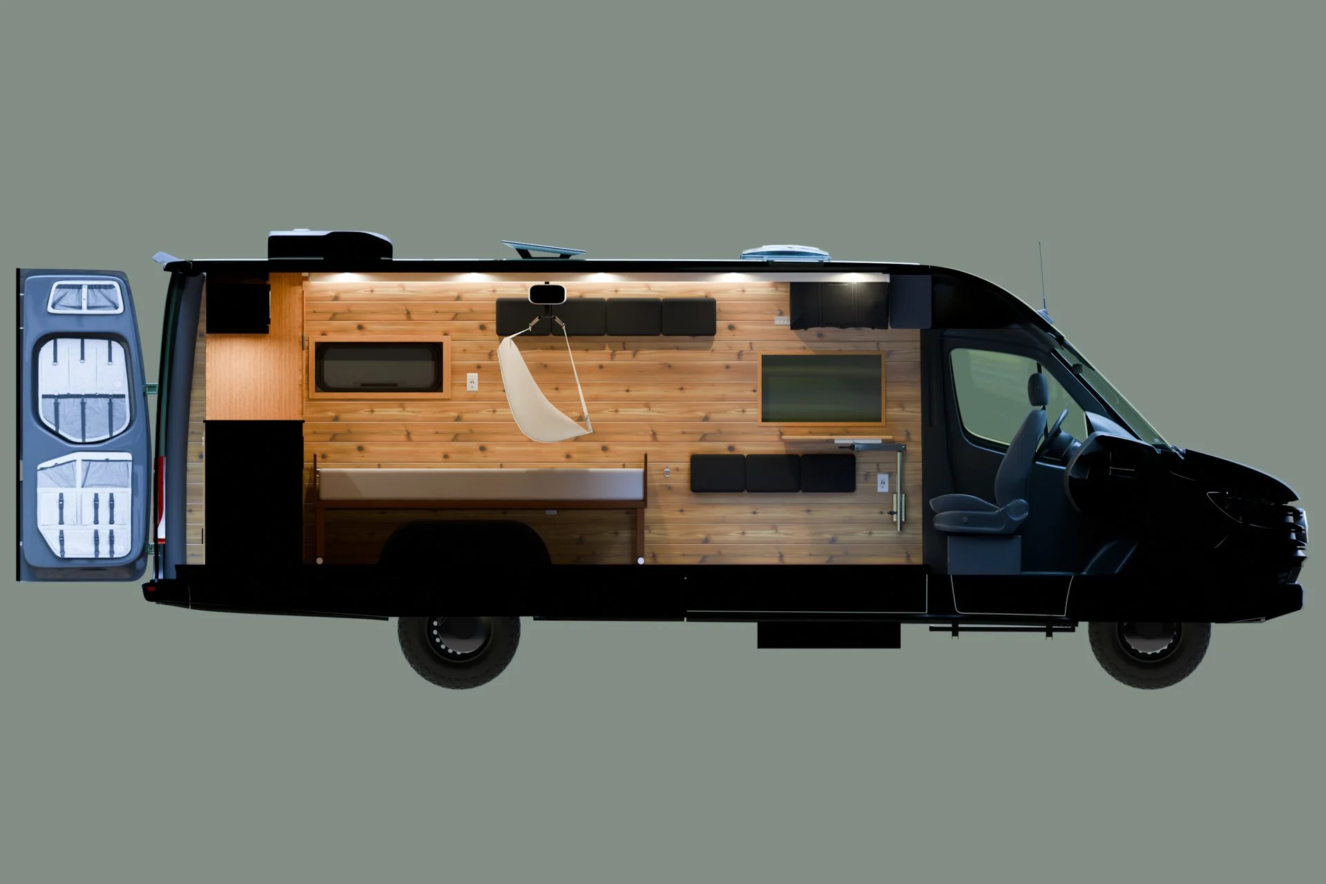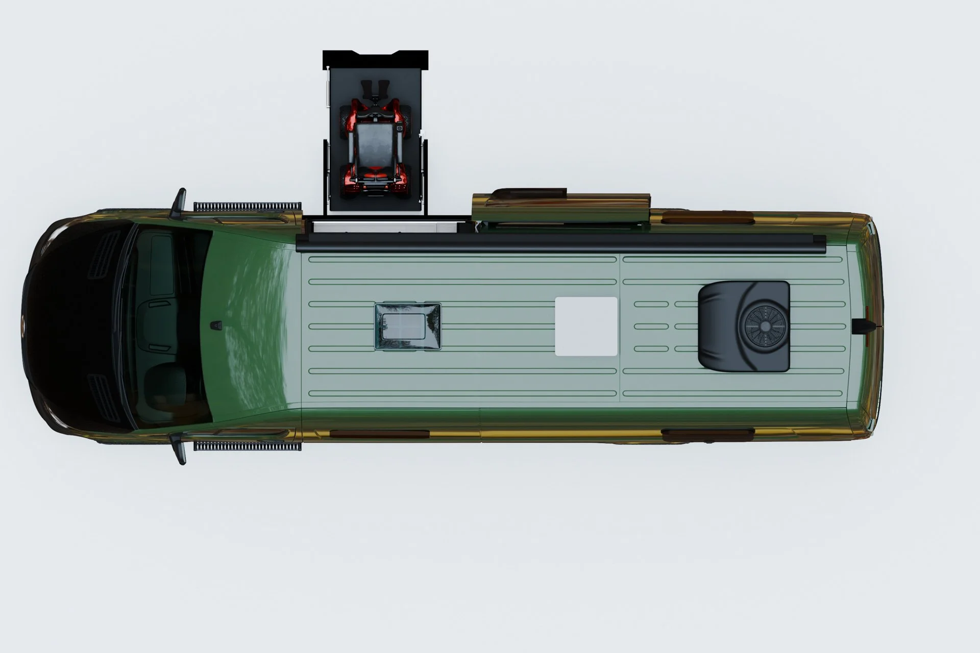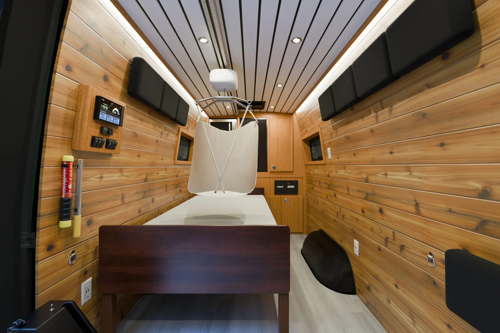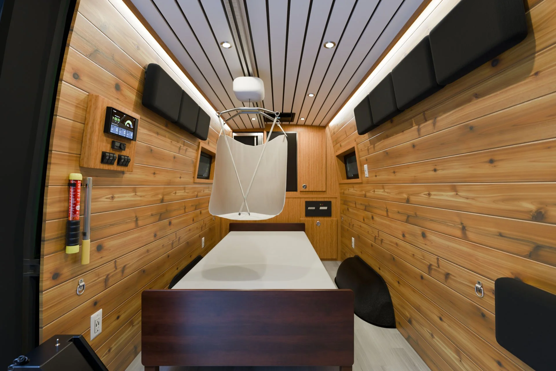 Featuring an Innovative Sling Rail System, Under Vehicle Lift, adjustable bed, a kitchenette, off-grid power, water, four season climate control, and your choice of interior finish.