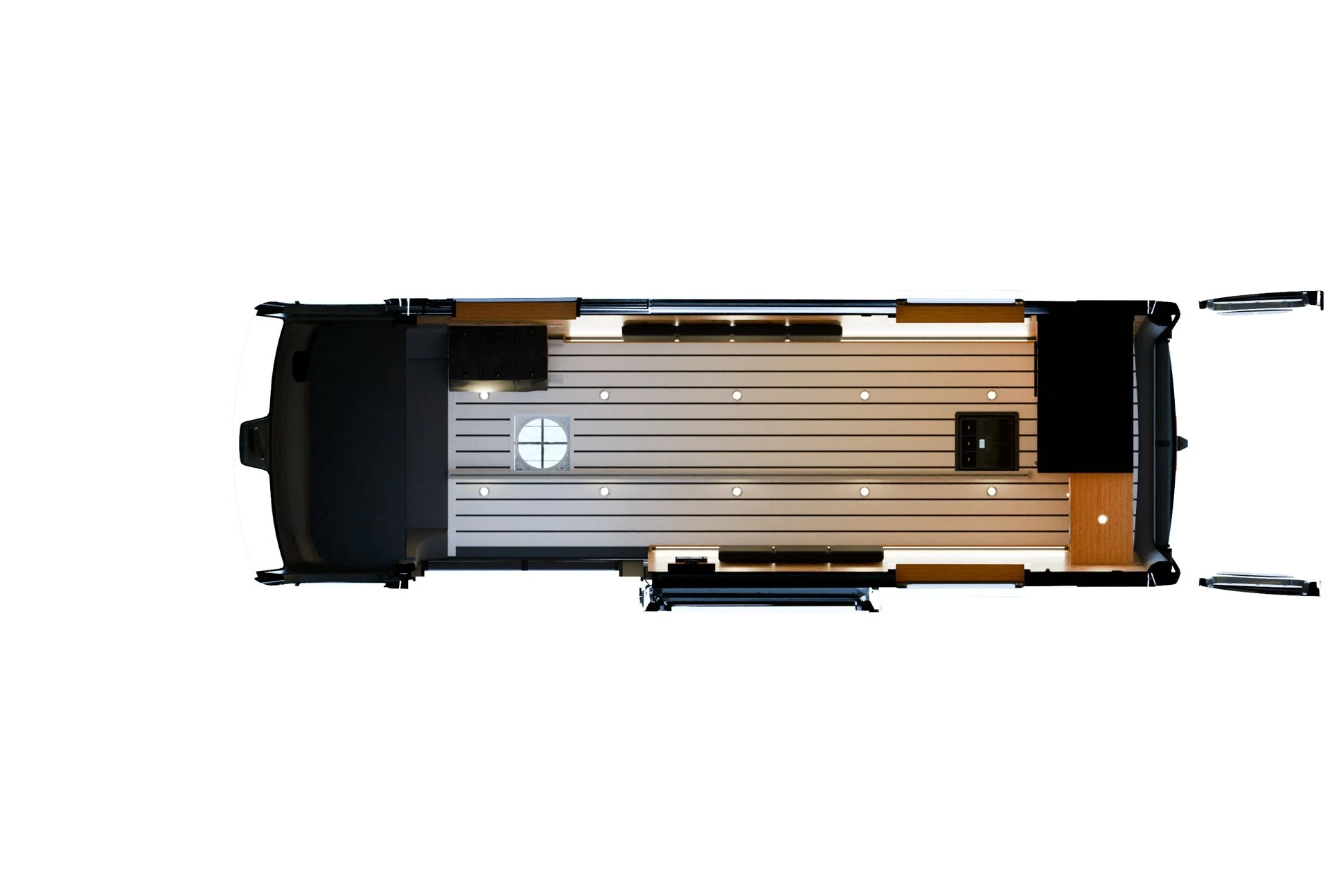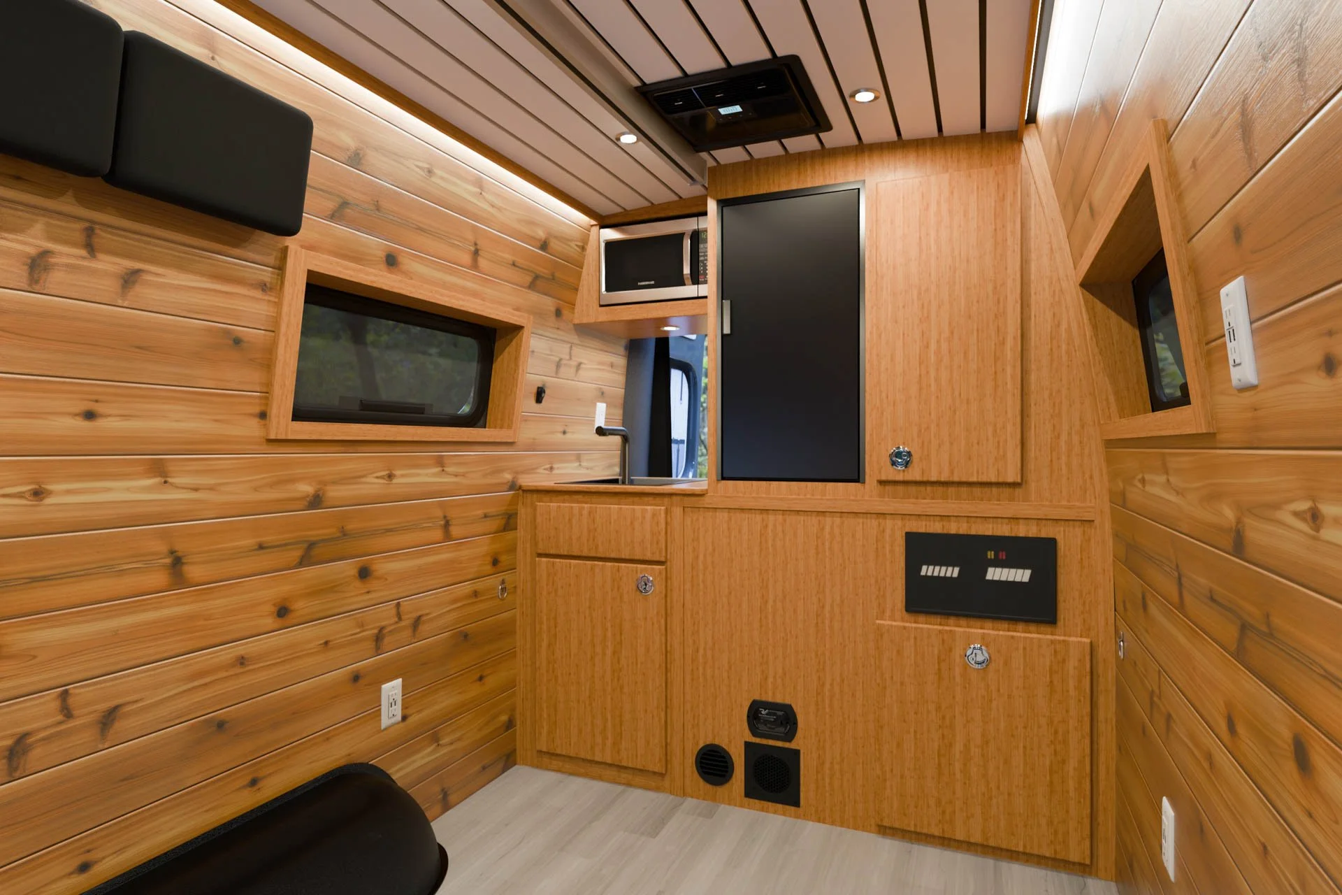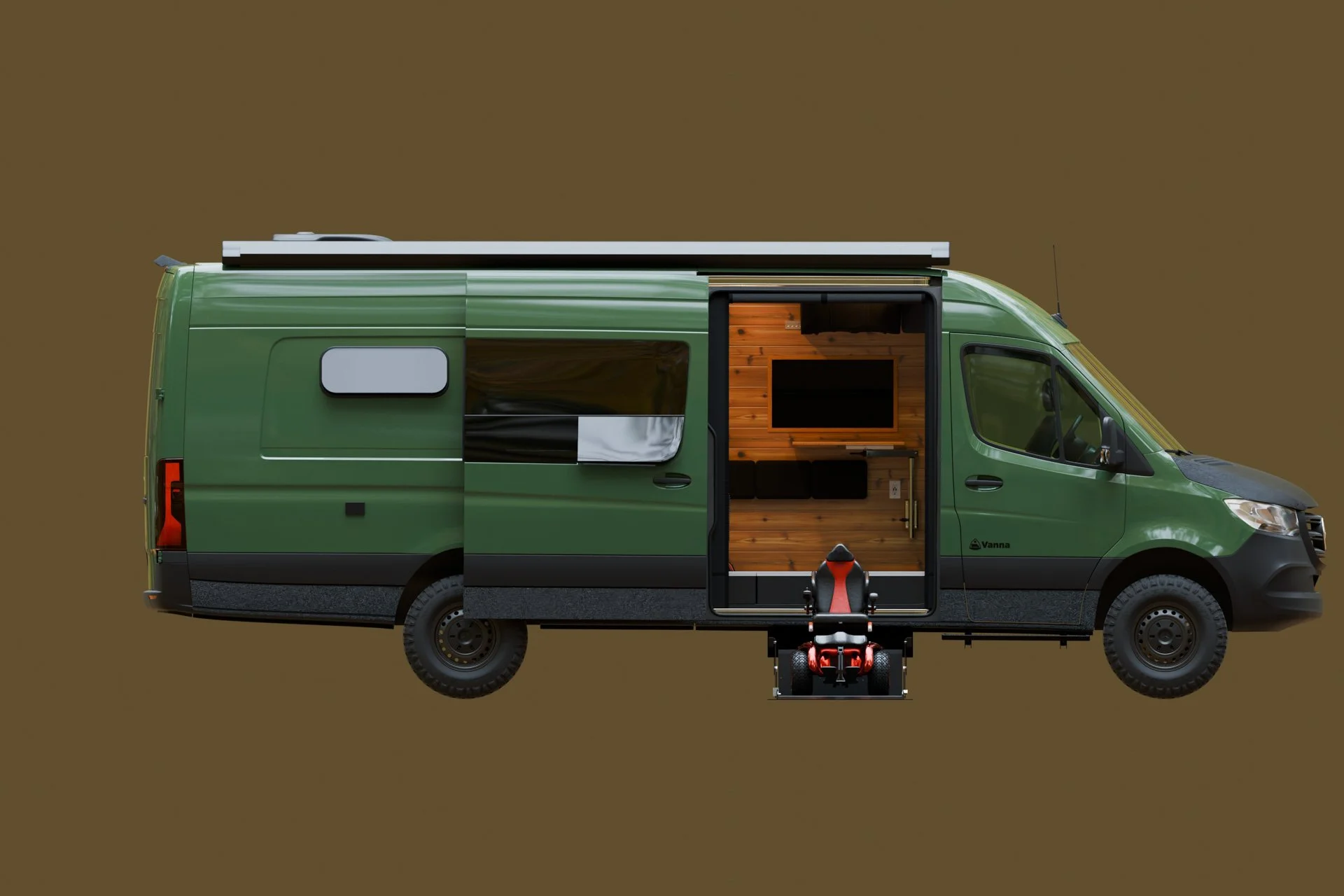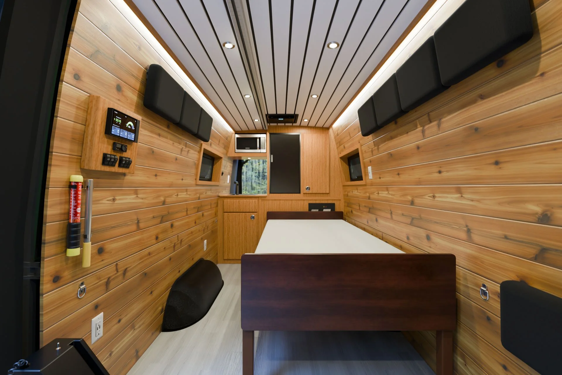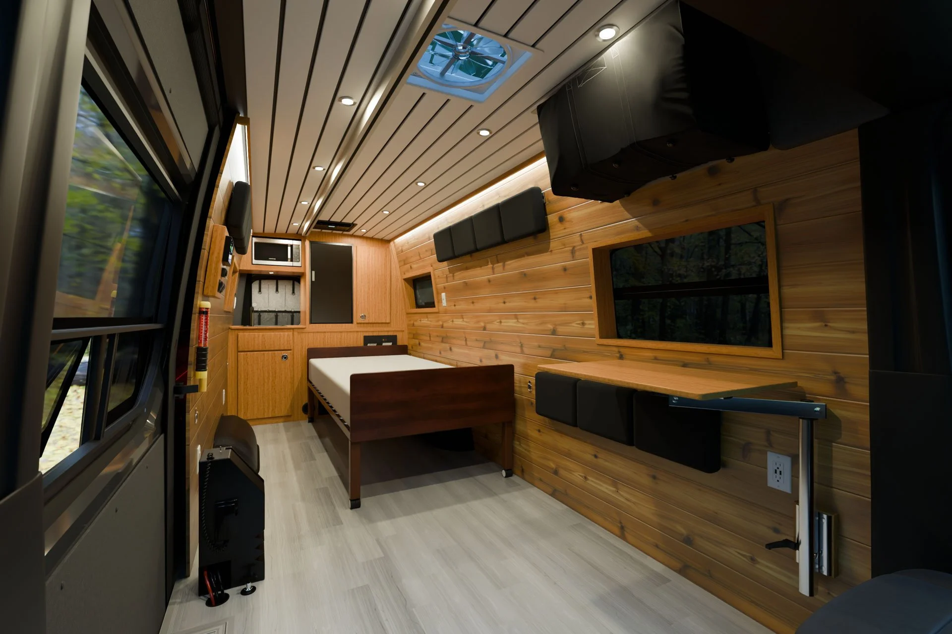 Featuring an Innovative Sling Rail System, Under Vehicle Lift, adjustable bed, a kitchenette, off-grid power, water, four season climate control, and your choice of interior finish.