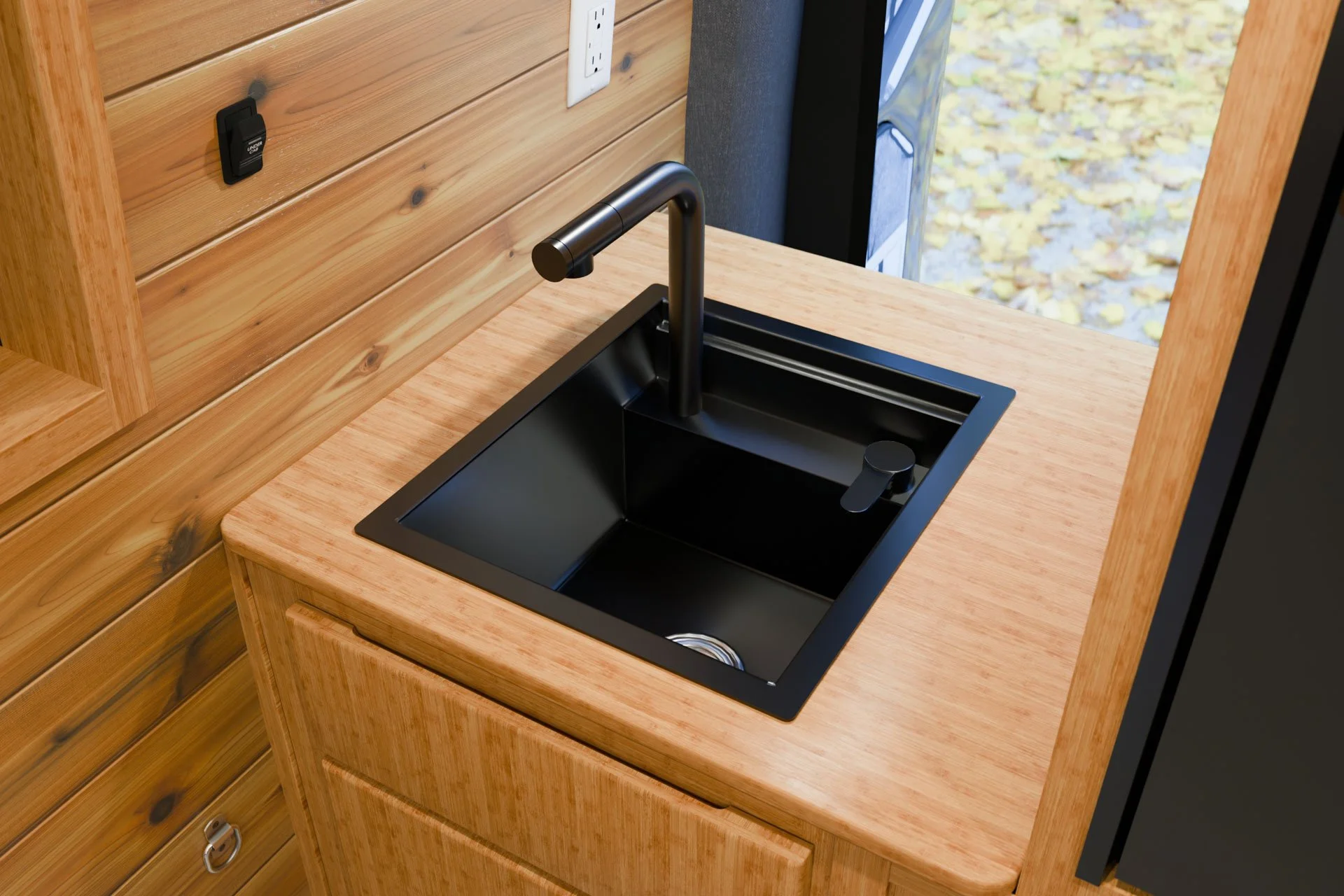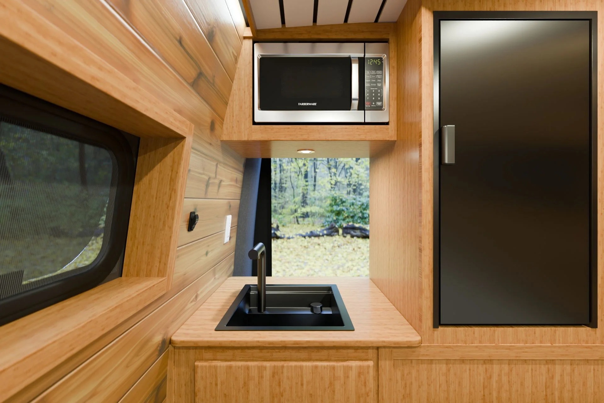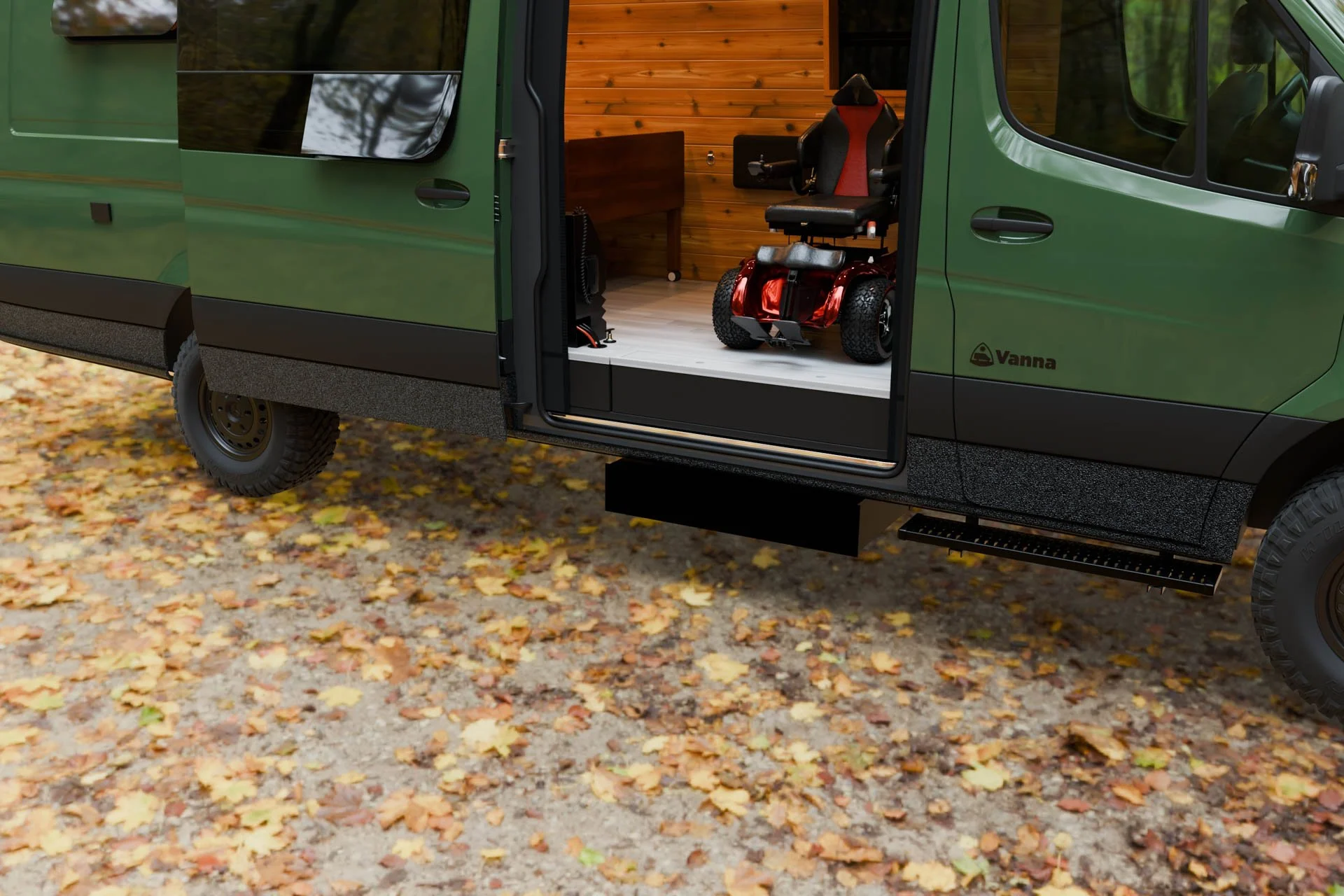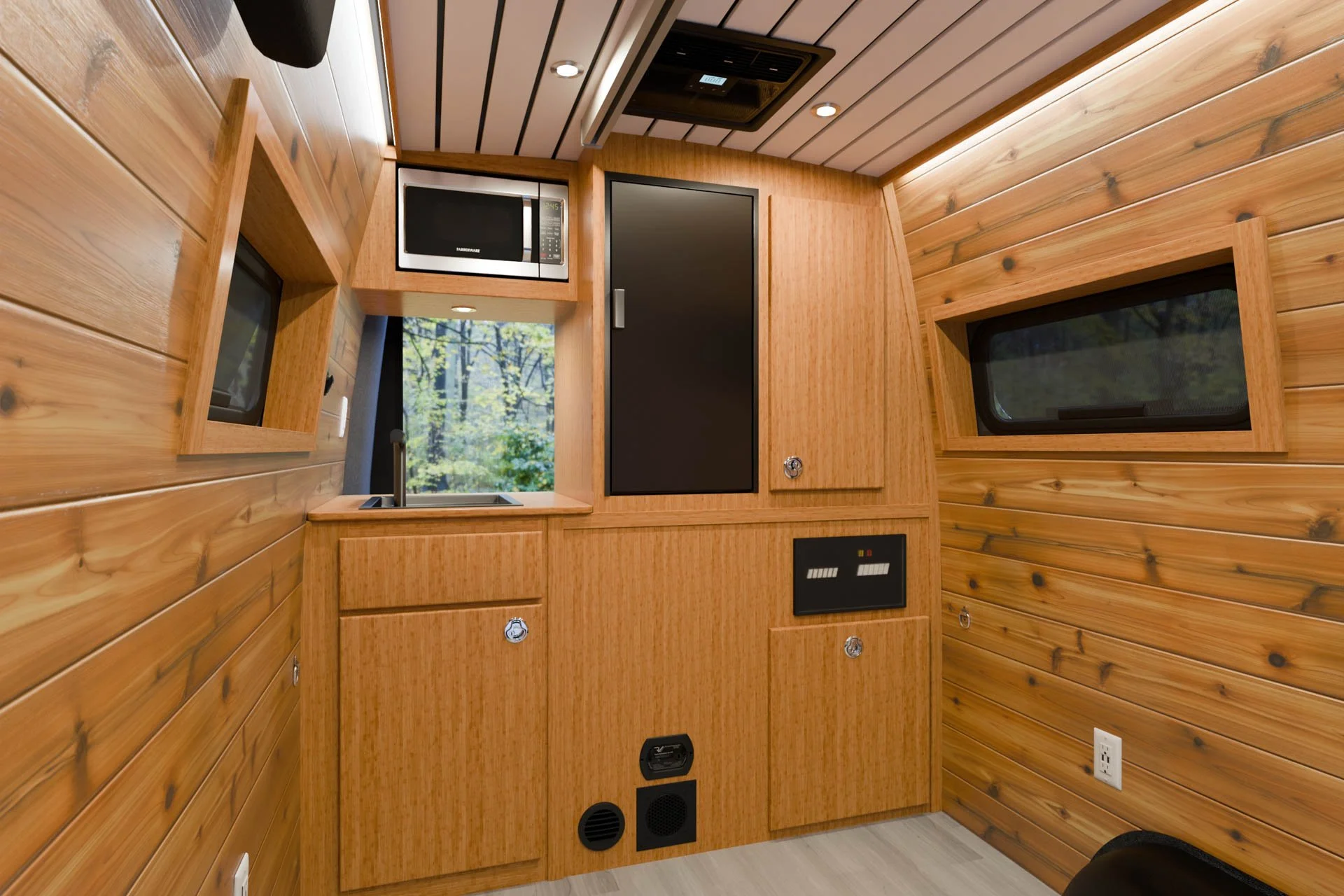 Featuring an Innovative Sling Rail System, Under Vehicle Lift, adjustable bed, a kitchenette, off-grid power, water, four season climate control, and your choice of interior finish.